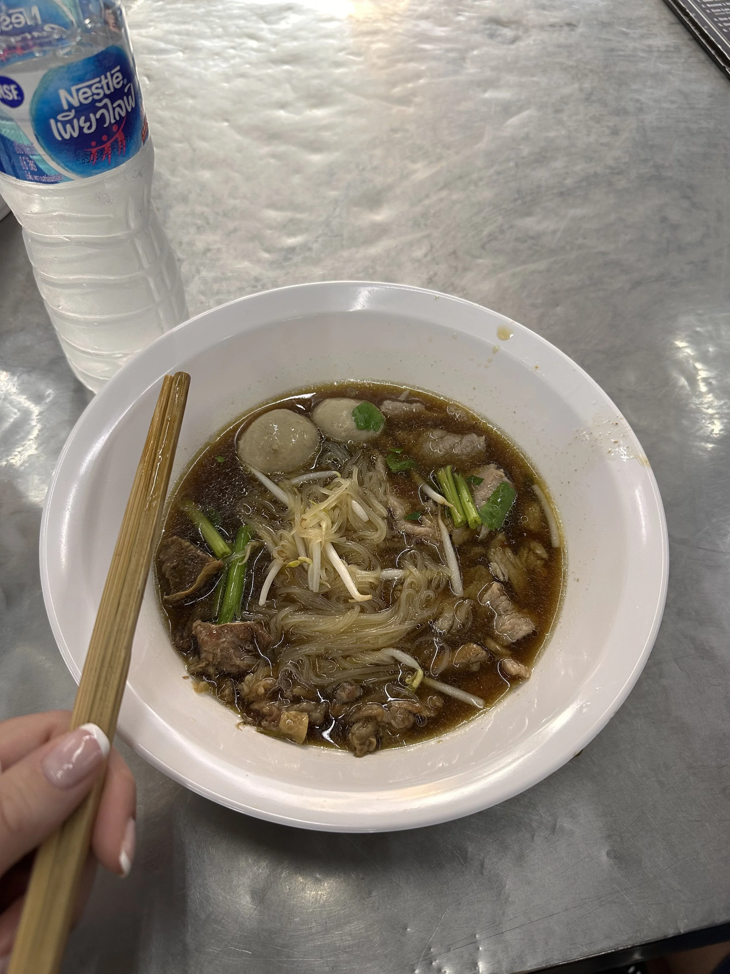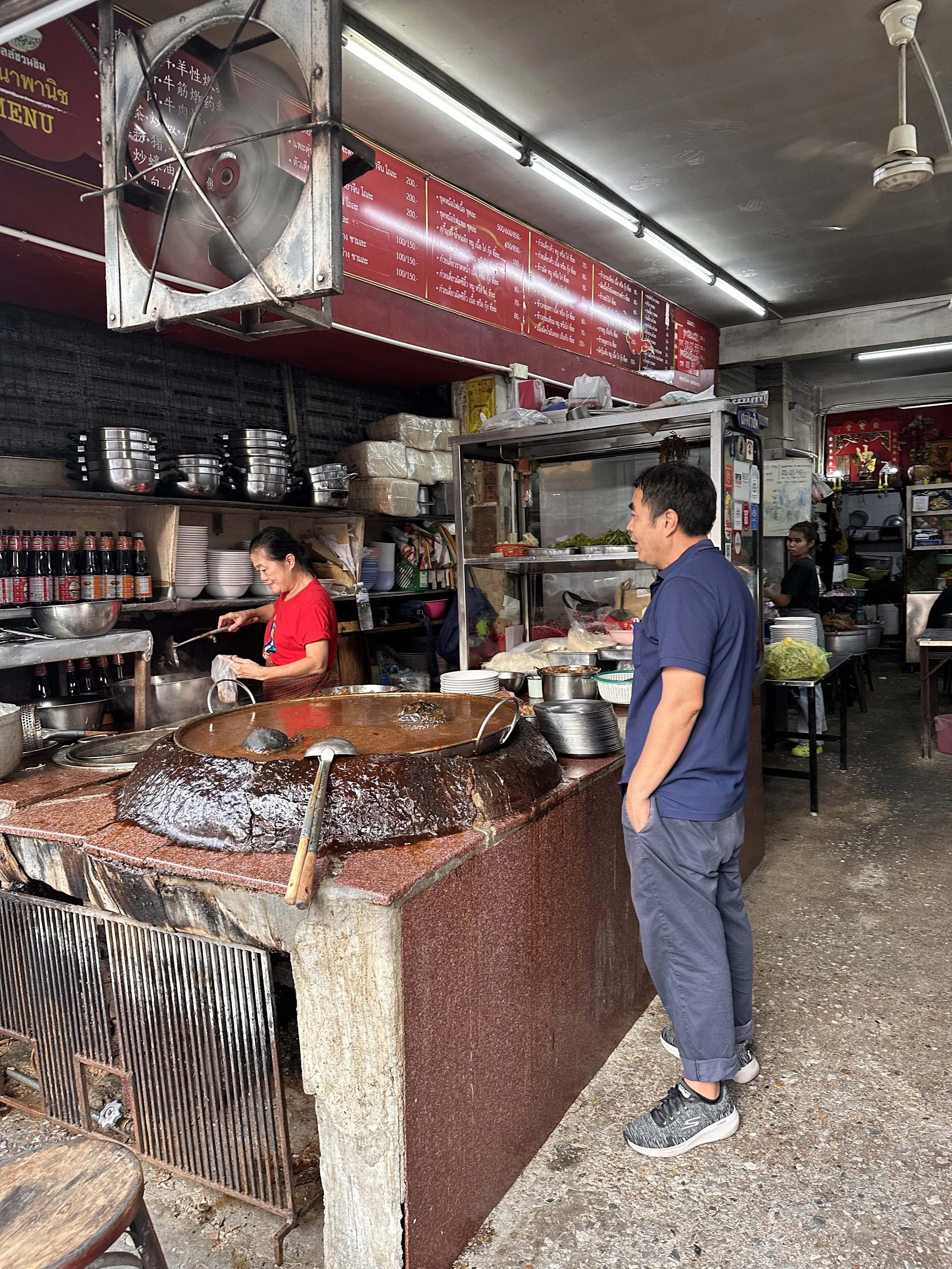 Braving Bangkok’s slow-moving traffic was worth every minute once we sat down at Wattana Panich. This legendary spot is renowned for its 40+ year-old goat soup, a broth that has been simmering continuously for decades. Each day, bones and fresh herbs are added to the pot, building layers of rich, complex flavor that make every bite unforgettable.